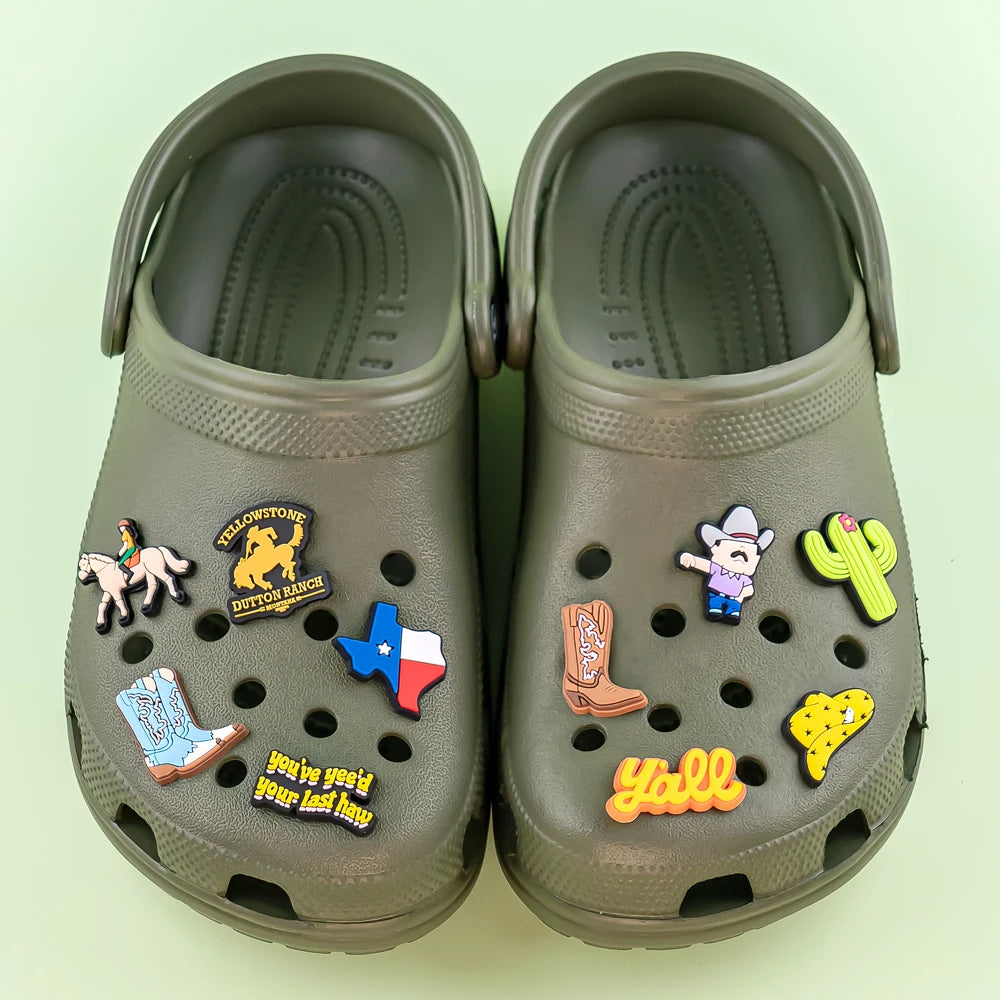 Bring the wild west to your walk with the CharmStep Western Vibes Shoe Charms — a playful collection of cowgirl hats, boots, horses, cacti, and western icons designed to snap into your Crocs-style clogs, slides, or charm bracelets.